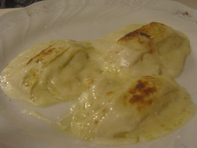 Bite size crepe pockets filled and topped with melted cheese fondue called Delizie