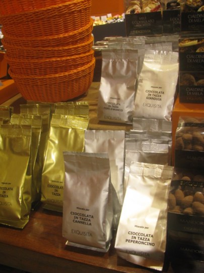 Gift baskets at Exquisita might be filled with small square chocolate wonders, such as: Chocolate pralines, flavored with locally grown Monte Baldo saffron; chocolate pralines, dedicated to Venice’s Palazzo Ducale, flavored with orange and Szechuan pepper in honor of Marco Polo; chocolate pralines, filled with Trentino’s grown white raisins and raspberries that celebrate Rovereto’s MART, the modern art museum; chocolate pralines shaped according to Depero’s futuristic designs and soaked in orange flavored Campari; chocolate pralines celebrating the Rovereto’s Archeology Festival prepared with layers of chocolate and acacia honey (honey suckle honey), and chocolate pralines filled with locally distilled grape skin “moonshine” called grappa and dedicated to Mozart, who played his first Italian piano concert in town during Christmas season in 1769.