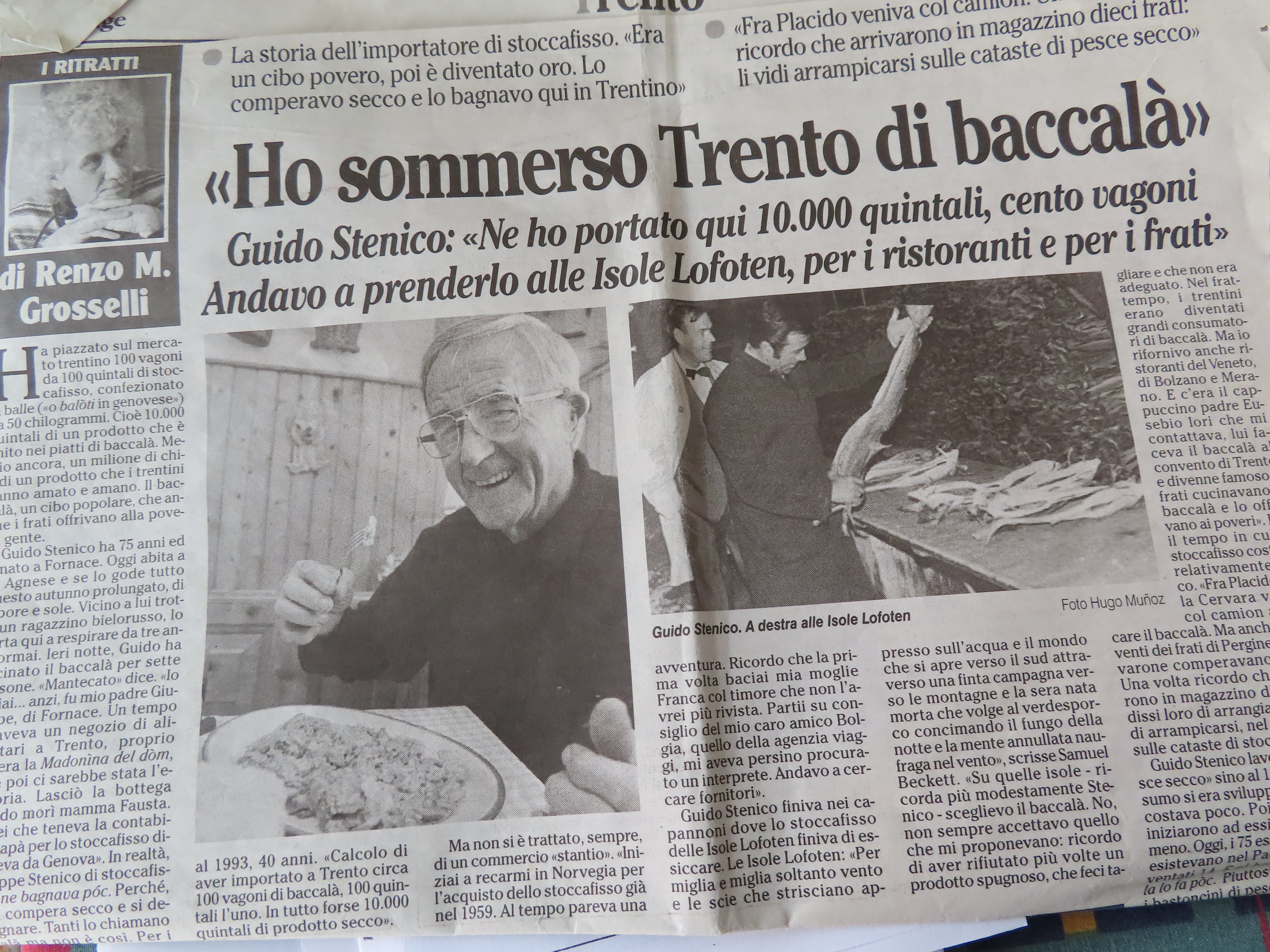 Since 1925 Mr. Stenico’s “baccala’s” business has been selling “stoccafisso” or “baccala'” in Trento. First the dried Norwegian cod was sold by his father and later, when the old man retired, by him together with his brother. Also Mr. Stenico is retired now, however, not retired entirely if someone asks him to prepare, serve and eat his favorite cod specialties.
