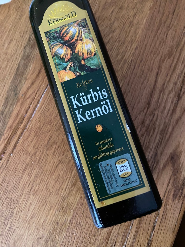 KUERBISSUPPE – KUERBISKERNE – KUERBISOEL: Pumpkin soup – shelled roasted pumpkin seeds – pumpkin oil.