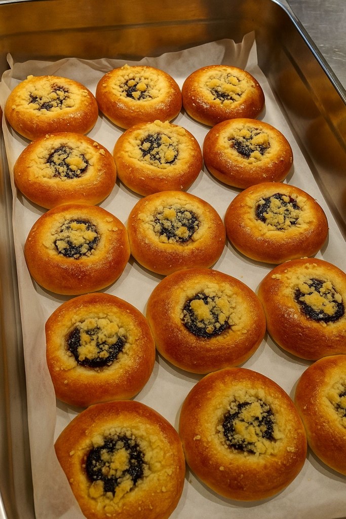 In the luke-warm milk, crumble the yeast with a tsp. sugar and 1 Tbsp. flour. Set aside for about 10-15 minutes until it makes bubbles. In a large mixing bowl, mix flour, sugar salt, and the egg yolks. Add the softened fat, the remaining milk and the risen yeast mixture. Either by hand or with a hand mixer with a dough hook, knead until obtaining a smooth and elastic dough. Cover the bowl with a clean towel and let the dough rise for 1-1 1/2 hours or until it has visibly risen and doubled in volume. Preheat the oven to 180 degrees Celsius (350 degrees F) . Shape the “kolaches” by tearing small balls of dough of the size of a gold ball and flatten them while creating a indentation in the middle. Top each “kolache” in its the indentation with plum jam (“povidla”). To fill the indentations, instead of jam, you may use either sweetened ricotta or cottage cheese (“tvaroh”) or poppy seed paste (“makova pasta”). For a final touch before placing in the warm oven: Brush the edges of each “kolache” with beaten egg and sprinkle each pastry with a “streusel” (butter, flour, sugar crumb mix). Bake for 15-20 minutes until the “kolaches” are shiny and golden brown.